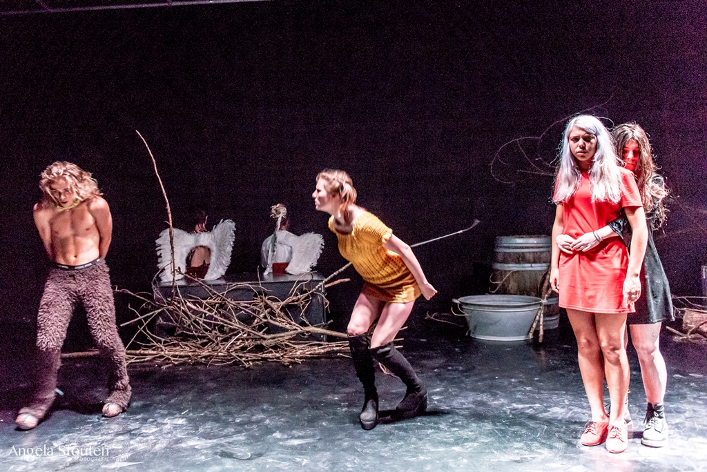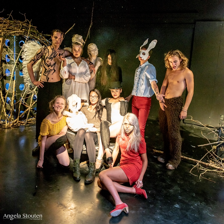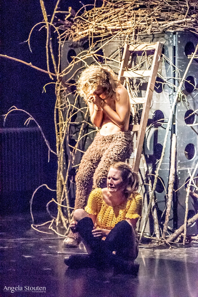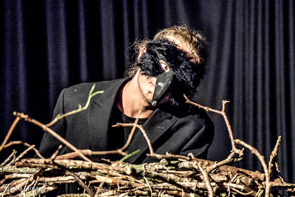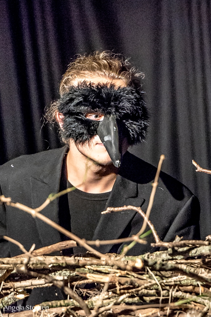 Montage door middel van wisselende lichtspots op de vloer. Belangrijk voor mijn rollen, de kraai en de sater, was vooral mijn fysiek. Ik heb zelf onderzoek gedaan naar de beweging van kraaien en hun anatomie om zo precies mogelijk de manier van bewegen te kopiëren. Ook stemgebruik was hier van belang. Hoe zou een kraai praten als mens? Hoe beweegt en praat een sater?